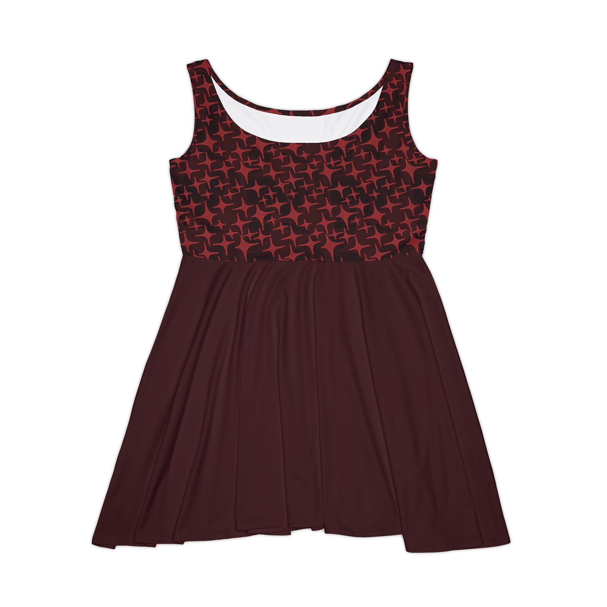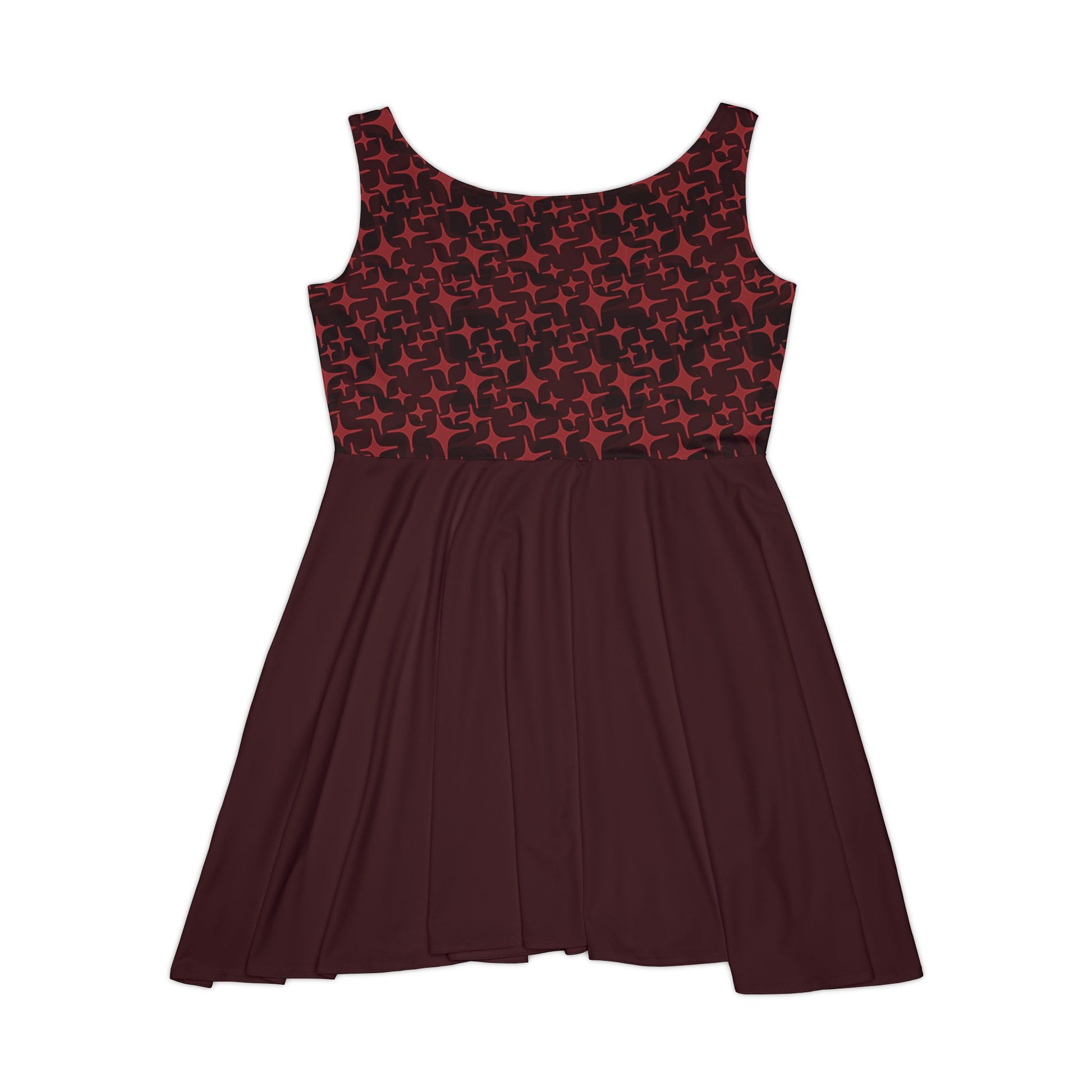 Make a bold statement with the Star Pattern Skater Dress (Deep Crimson) — a captivating All Over Print (AOP) creation by Aria, designed to explore how movement and geometry interact through fabric. The dynamic star motif wraps the silhouette in rhythm and energy, giving this piece a striking yet effortless appeal.