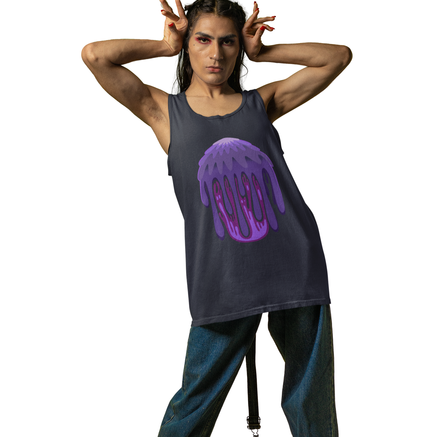 This Toxic Shock Tank brings the same meltdown mood as its tee and long-sleeve siblings — now in a breezy, sleeveless cut. With a surreal purple ooze print on lightweight cotton jersey, it's the perfect drip for summer heat, late-night raves, or mutant daydreams.